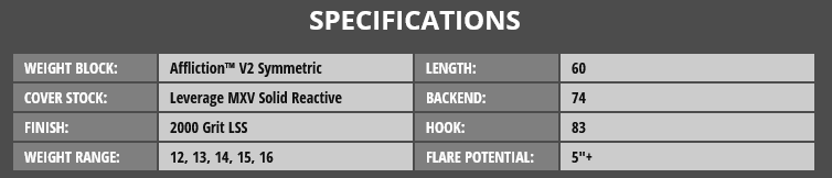 Wrapped around the Affliction V2 core is the new Leverage MXV Solid reactive coverstock. This cover evolved for today’s conditions. Strong enough to chew through high volumes of oil but versatile enough to create motion when lanes are tight. It’s as strong in the soup as the Subzero Forge or Jackal Onyx, but it keeps its shape downlane for more drive through the pins. While previous Leverage covers were built to smooth things out, the Raptor Reign dominates carrydown with nonstop drive. Don’t chase reaction, impose it with the Raptor Reign.